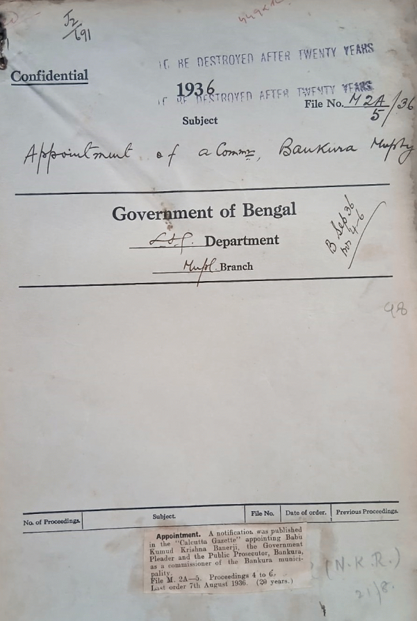 | Rack No. 12, Bundle No. 08 Sl No. 545 Dengal Passage Rules Eligibility of the officers etc for the passage commissioners. | Rack No. 12, Bundle No. 08 Sl No. 546 Adoption of the model bye laws regarding the prohibition and regulation of traffic by the Baruipur Municipality. | Rack No. 12, Bundle No. 08 Sl No. 547 LA. by the Calcutta Improvement Trust for aligoment No. VI. Calcutta Municipality. | Rack No. 12, Bundle No. 08 Sl No. 548 Appointment of a Commissioner, Dankura Municipality. | Rack No. 12, Bundle No. 08 Sl No. 549 Free use of ambulance car in maternity cases, garden Reach municipality, | Rack No. 12, Bundle No. 08 Sl No. 550 Extension of the Provisions of Chapter X of the B.M. Act, 1932 to the garden Reach municipality. | Rack No. 12, Bundle No. 09 Sl No. 551 Revision of assessment, Kishorganj Municipality. |