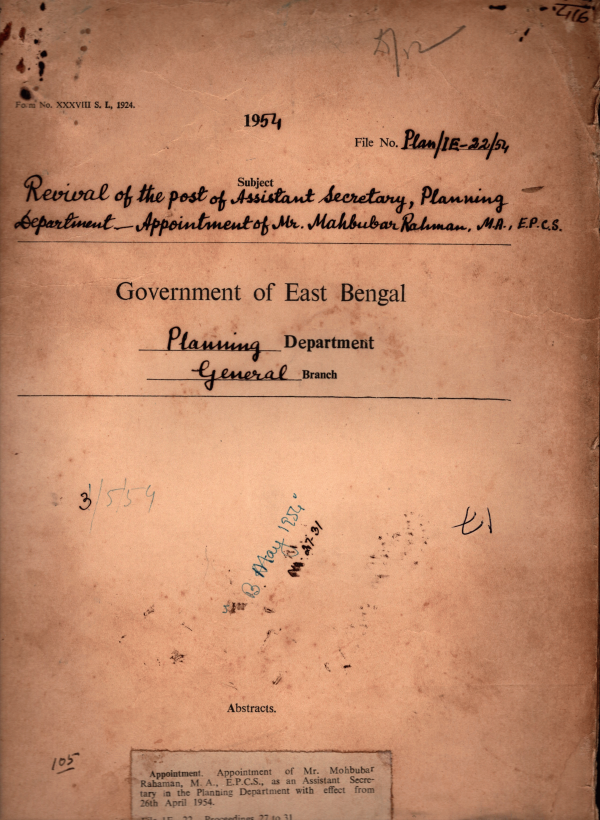 Appointment of Mr. Mohbubar Rahaman M.A. E.P.C.S as an Assistant Secretary in the Planning Department with effect from 26th April 1954.