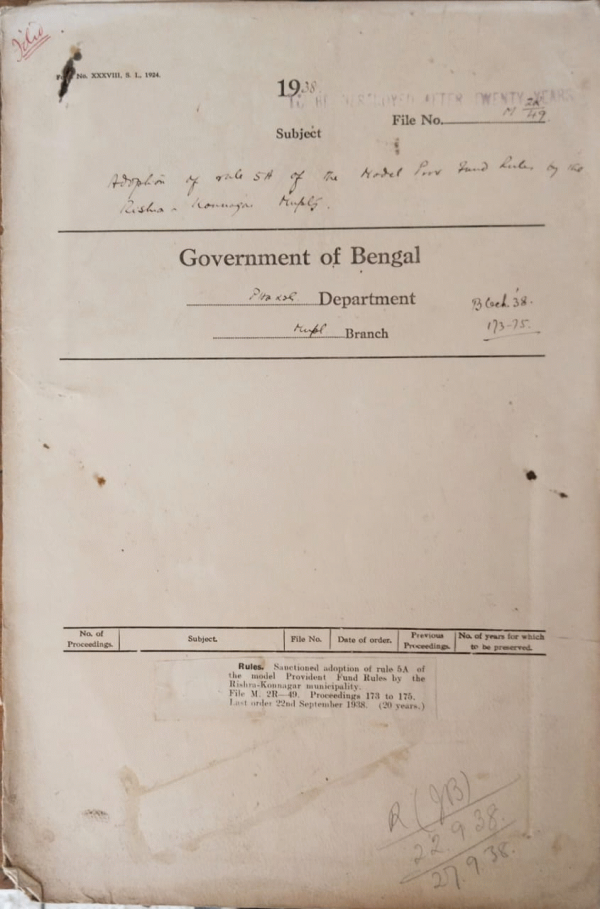| Rack No. 12, Bundle No. 14, Sl No. 973 Postponement of the quinquinal revision of the assessment of Municipal holdings at Kurseong Municipality. | Rack No. 12, Bundle No. 14, Sl No. 974 Appropriation Accounts of the High Commissioner for India an behalf of the govt. of Bengal. | Rack No. 12, Bundle No. 14, Sl No. 975 Specific Sanction for provisional receipts to be granted by the Jalpaiguri Municipality. | Rack No. 12, Bundle No. 14, Sl No. 976 Adoption of rate SA of the Model P.F. Rules by the Rishra Konnagar Municipality. | Rack No. 12, Bundle No. 14, Sl No. 977 Payment of a fee of Rs. 16/- to each commissioner, Dum Dum Municipality for attending general meeting under section 108. of the B.M. Act. | Rack No. 12, Bundle No. 6, Sl No. 331 L..A. by Calcutta Improvement Trust for Alignment No. IX. | Rack No. 12, Bundle No. 6, Sl No. 332 L..A. by Calcutta Improvement Trust for Alignment No. IX. |