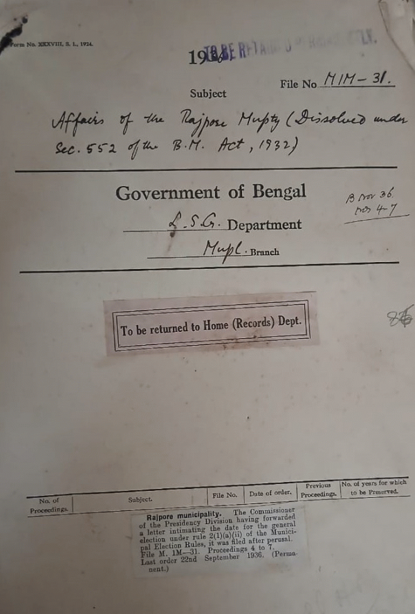 | Rack No. 12, Bundle No. 09 Sl No. 583 Inspection Note Champdany Municipality. | Rack No. 12, Bundle No. 09 Sl No. 585 . Appointment of a Commissioner, Nabadwip Municipality | Rack No. 12, Bundle No. 09 Sl No. 585 Adoption of the model bye-laws regarding the conduct of business in places used for the purpose by the Tollyganj Municipality. | Rack No. 12, Bundle No. 09 Sl No. 586 Affairs of the Rajpore municipality (Sec. 552 of the B.M. Act, 1932). | Rack No. 12, Bundle No. 09 Sl No. 587 Exercise of all the powers of the Chairman by the Vice-Chairman during the Chairman's absence for whatever reason. | Rack No. 12, Bundle No. 09 Sl No. 588 Grant from the Calcutta Corporation to the Bengal Social Service league. | Rack No. 12, Bundle No. 09 Sl No. 589 Grant by the Calcutta Corporation to the Dharamsala at 226, Harrison Road. |