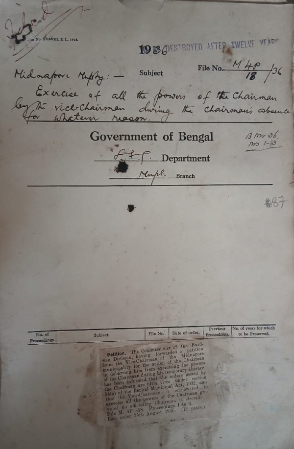 | Rack No. 12, Bundle No. 09 Sl No. 585 . Appointment of a Commissioner, Nabadwip Municipality | Rack No. 12, Bundle No. 09 Sl No. 585 Adoption of the model bye-laws regarding the conduct of business in places used for the purpose by the Tollyganj Municipality. | Rack No. 12, Bundle No. 09 Sl No. 586 Affairs of the Rajpore municipality (Sec. 552 of the B.M. Act, 1932). | Rack No. 12, Bundle No. 09 Sl No. 587 Exercise of all the powers of the Chairman by the Vice-Chairman during the Chairman's absence for whatever reason. | Rack No. 12, Bundle No. 09 Sl No. 588 Grant from the Calcutta Corporation to the Bengal Social Service league. | Rack No. 12, Bundle No. 09 Sl No. 589 Grant by the Calcutta Corporation to the Dharamsala at 226, Harrison Road. | Rack No. 12, Bundle No. 09 Sl No. 590 Grant of a personal allowance to Babu Maniklal Sen, H/C, by Calcutta Improvement Trust. |