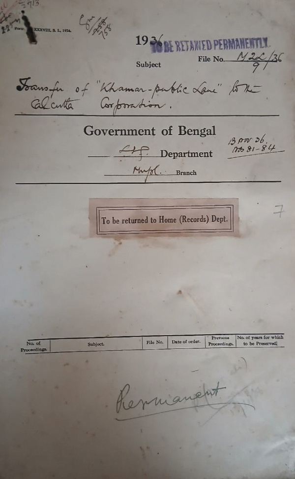 | Rack No. 12, Bundle No. 09 Sl No. 604 Adoption of the Model Conditions for the grant of licenses for Slaughter houses by the Bally Municipality. | Rack No. 12, Bundle No. 09 Sl No. 605 Adoption of the new P.F. Rule 5A by the Jessore Municipality. | Rack No. 12, Bundle No. 09 Sl No. 606 Extension of Section 415 of the B. M. Act, 1932 to the Nator Municipality. | Rack No. 12, Bundle No. 09 Sl No. 607 Transfer of "Khamar Public Lane to the Calcutta Corporation". | Rack No. 12, Bundle No. 09 Sl No. 608 Proposal for increment of Salary of the Telephone operators, Calcutta Fire Brigade. | Rack No. 12, Bundle No. 09 Sl No. 609 Appointment of Mr. P. Bose of the Satal Engineering works, a member of the licensing board as a representative of electrical constructors in Bengal. | Rack No. 12, Bundle No. 09 Sl No. 610 Adoption of the Model Rules of business together with the Amendments by the Asansol Municipality. |