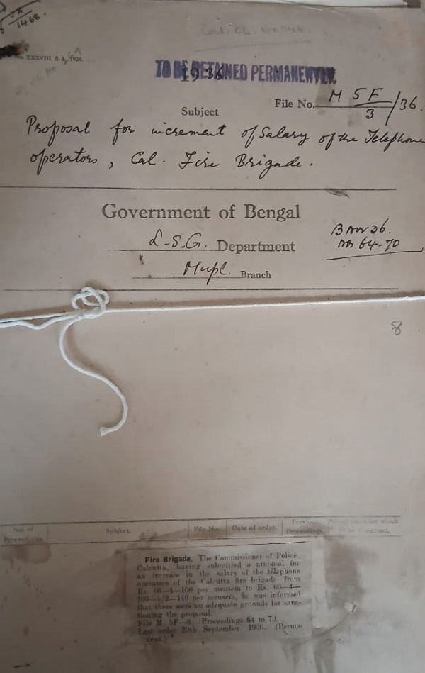 | Rack No. 12, Bundle No. 09 Sl No. 605 Adoption of the new P.F. Rule 5A by the Jessore Municipality. | Rack No. 12, Bundle No. 09 Sl No. 606 Extension of Section 415 of the B. M. Act, 1932 to the Nator Municipality. | Rack No. 12, Bundle No. 09 Sl No. 607 Transfer of "Khamar Public Lane to the Calcutta Corporation". | Rack No. 12, Bundle No. 09 Sl No. 608 Proposal for increment of Salary of the Telephone operators, Calcutta Fire Brigade. | Rack No. 12, Bundle No. 09 Sl No. 609 Appointment of Mr. P. Bose of the Satal Engineering works, a member of the licensing board as a representative of electrical constructors in Bengal. | Rack No. 12, Bundle No. 09 Sl No. 610 Adoption of the Model Rules of business together with the Amendments by the Asansol Municipality. | Rack No. 12, Bundle No. 09 Sl No. 611 Adoption of model bye-laws relating to public water supply etc. by the Baidyabati Municipality. |