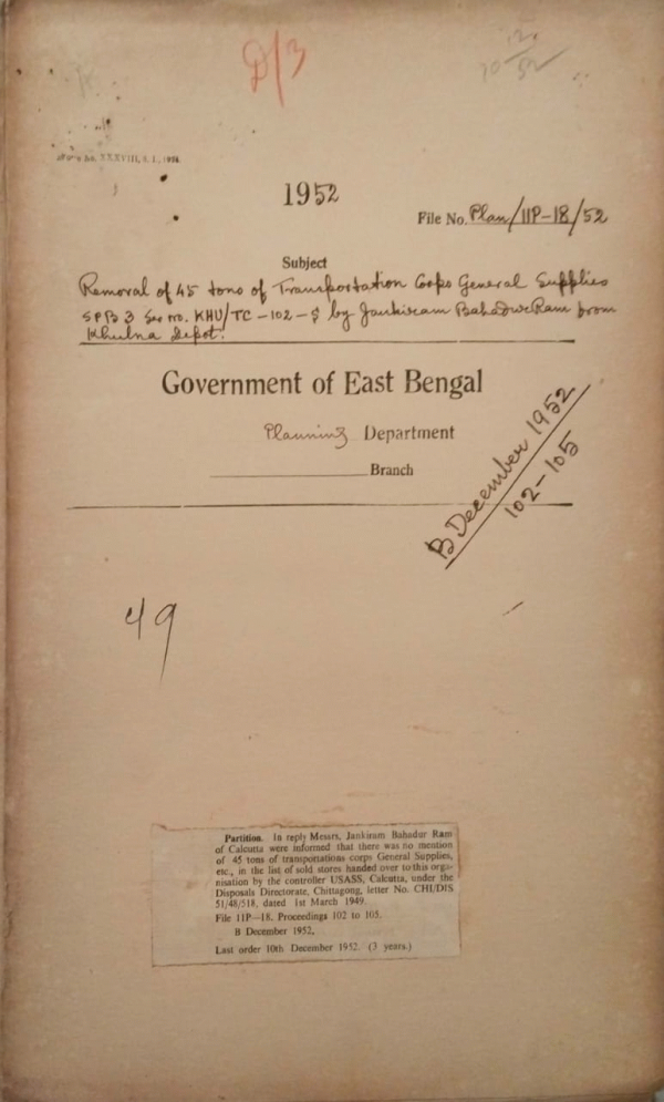 | Rack No. 36, Bundle No. 06, SI No. 278 Expenditure and Resources committee set up of the- | Rack No. 36, Bundle No. 06, SI No. 279 Transport of floating barge belonging to govt. of India from Khulna to Calcutta. | Rack No. 36, Bundle No. 06, SI No. 280 Purchase of various cranes at Khulna depot by Tulshiram Bhagwandas. | Rack No. 36, Bundle No. 06, SI No. 281 Release of transportation corps general supplies to M/S. Jakiram Bahadur Ram. | Rack No. 36, Bundle No. 06, SI No. 282 Return of Securities of M/S. Asistic construction Company. | Rack No. 36, Bundle No. 06, SI No. 283 Disposal of arrear claims against the province of undivided Bengal. | Rack No. 36, Bundle No. 06, SI No. 284 21 Twin Nissen Huts belonging by West Bengal to East Bengal. |