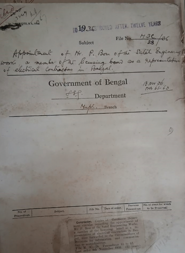| Rack No. 12, Bundle No. 09 Sl No. 606 Extension of Section 415 of the B. M. Act, 1932 to the Nator Municipality. | Rack No. 12, Bundle No. 09 Sl No. 607 Transfer of "Khamar Public Lane to the Calcutta Corporation". | Rack No. 12, Bundle No. 09 Sl No. 608 Proposal for increment of Salary of the Telephone operators, Calcutta Fire Brigade. | Rack No. 12, Bundle No. 09 Sl No. 609 Appointment of Mr. P. Bose of the Satal Engineering works, a member of the licensing board as a representative of electrical constructors in Bengal. | Rack No. 12, Bundle No. 09 Sl No. 610 Adoption of the Model Rules of business together with the Amendments by the Asansol Municipality. | Rack No. 12, Bundle No. 09 Sl No. 611 Adoption of model bye-laws relating to public water supply etc. by the Baidyabati Municipality. | Rack No. 12, Bundle No. 09 Sl No. 612 Statement of grant a appropriation and expenditure up to March 1935-36. |