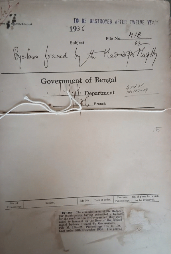 | Rack No. 12, Bundle No. 09 Sl No. 612 Statement of grant a appropriation and expenditure up to March 1935-36. | Rack No. 12, Bundle No. 09 Sl No. 613 Proposal for postal Endowment police of Mvi. Nurul Hoque, L.S.G. Department. | Rack No. 12, Bundle No. 09 Sl No. 614 Adoption of Model rules regarding the duties of Sanitary Inspectors, by the Baidyebati Municipality. | Rack No. 12, Bundle No. 09 Sl No. 615 Bye-laws framed by the Madaripur Municipality. | Rack No. 12, Bundle No. 09 Sl No. 616 Adoption of the model bye-laws for the control etc of dangerous diseases, by the Bhatpara Municipality | Rack No. 12, Bundle No. 09 Sl No. 617 Adoption of model bye laws for the control of dangerous diseases by the Rangpur Municipality. | Rack No. 12, Bundle No. 09 Sl No. 618 Inspection Note Sherpur Municipality. |