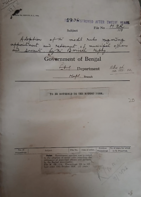 | Rack No. 12, Bundle No. 09 Sl No. 617 Adoption of model bye laws for the control of dangerous diseases by the Rangpur Municipality. | Rack No. 12, Bundle No. 09 Sl No. 618 Inspection Note Sherpur Municipality. | Rack No. 12, Bundle No. 09 Sl No. 619 Adoption of the model Bye-Laws relating to Standardization of weights and measures by the Mymensingh Municipality. | Rack No. 12, Bundle No. 09 Sl No. 620 Adoption of the model rules regarding appointment and retirement of Municipal officers and Servants by the Barisal Municipality. | Rack No. 12, Bundle No. 09 Sl No. 621 Adoption of the amendments in the model rules of Business By the Baidyabati Municipality. | Rack No. 12, Bundle No. 09 Sl No. 622 Adoption of the model bye-laws regulating dairies and milk supply by the Baidyabati Municipality. | Rack No. 12, Bundle No. 09 Sl No. 623 Loan of Re: 50,000/- for the establishment of a nicipal market and the conversion of the Menimcipal ronds Barisal Municipality |