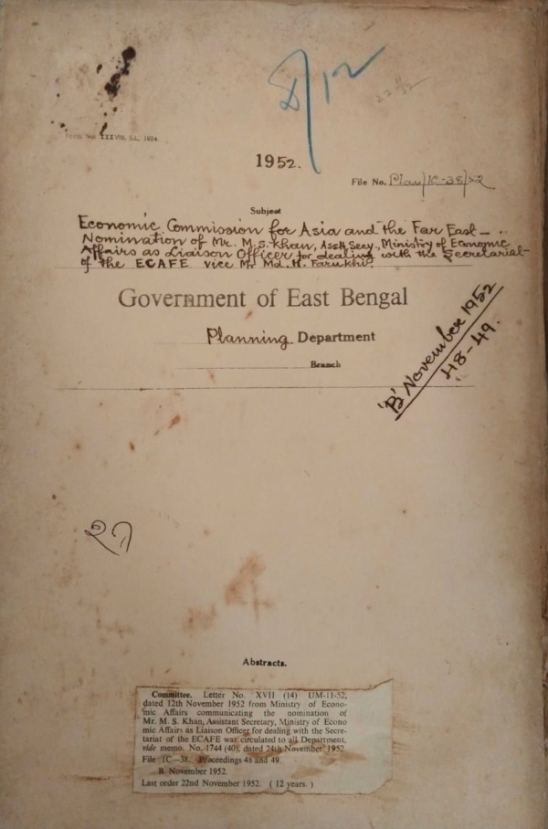 | Rack No. 36, Bundle No. 06, SI No. 305 Purchase of steel foxes for officers of the planning department. | Rack No. 36, Bundle No. 06, SI No. 306 Instruction regarding curtailment of expenditure. | Rack No. 36, Bundle No. 06, SI No. 307 Pre-partition claims of Govt. servants opting for East Bengal. | Rack No. 36, Bundle No. 06, SI No. 308 Economic commission for Asia and the far East Nomination of Mr. M.S. Khan Assistant Secretary ministry of economic affairs as liaison officer for dealing with the secretariat of the ECAFE Vice Mr. Md. H. Farukhi. | Rack No. 36, Bundle No. 06, SI No. 309 Resolution for the administrative council VII session. | Rack No. 36, Bundle No. 06, SI No. 310 Schedule for 1953-54 under 63-B- development. | Rack No. 36, Bundle No. 06, SI No. 311 Forecast Budget Estimates 1953-54 under charges in England. |