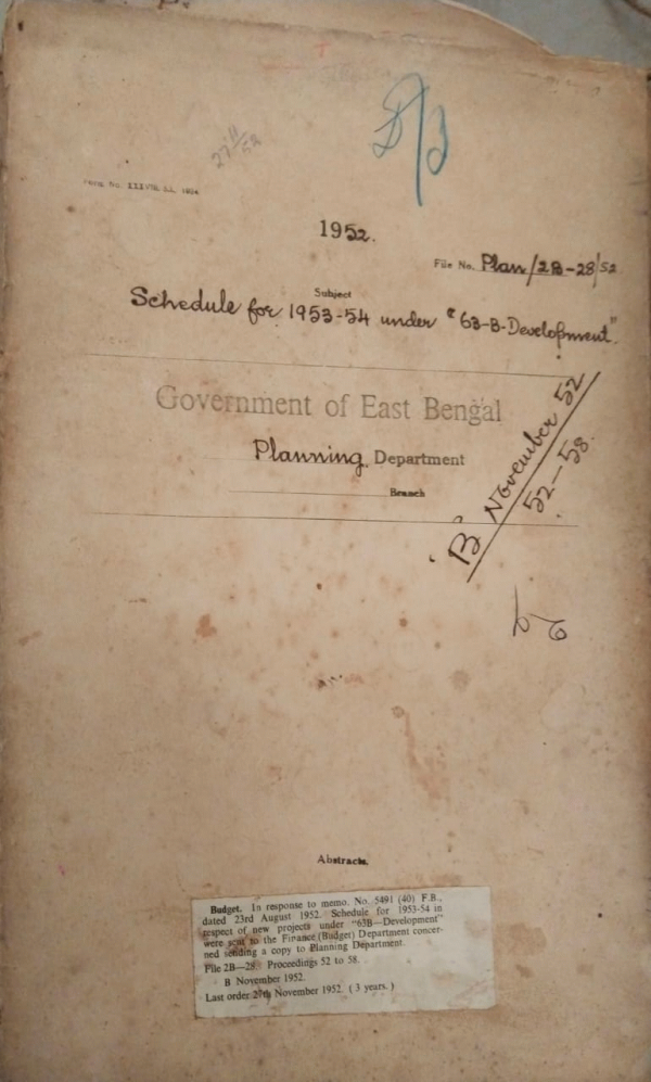 | Rack No. 36, Bundle No. 06, SI No. 307 Pre-partition claims of Govt. servants opting for East Bengal. | Rack No. 36, Bundle No. 06, SI No. 308 Economic commission for Asia and the far East Nomination of Mr. M.S. Khan Assistant Secretary ministry of economic affairs as liaison officer for dealing with the secretariat of the ECAFE Vice Mr. Md. H. Farukhi. | Rack No. 36, Bundle No. 06, SI No. 309 Resolution for the administrative council VII session. | Rack No. 36, Bundle No. 06, SI No. 310 Schedule for 1953-54 under 63-B- development. | Rack No. 36, Bundle No. 06, SI No. 311 Forecast Budget Estimates 1953-54 under charges in England. | Rack No. 36, Bundle No. 06, SI No. 312 Half yearly progress report in respect of development schemes revenue department. | Rack No. 36, Bundle No. 06, SI No. 313 Entertainment of official delegates prior approval of finance department to obtain for the expenditure incurred on that account. |