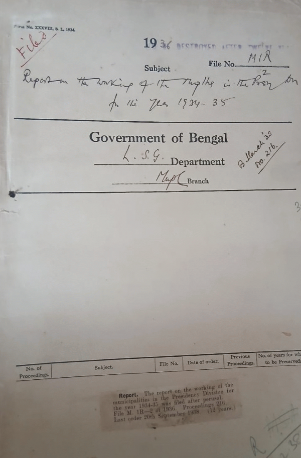 | Rack No. 12, Bundle No. 10 Sl No. 627 Proposed bye-laws forbidding any erection in the Both side of the K.C. Dey Strand Road from the Mukherjee ghatle to the Chaudhury's ghatia | Rack No. 12, Bundle No. 10 Sl No. 628 Adoption of model bye-laws regarding standardization of weights and measures by the Bhetpere Municipality | Rack No. 12, Bundle No. 10 Sl No. 629 LA by the Comdle Municipality for widening out the Dharmasagar back Road in the village of Chhotare of the Comilla town. | Rack No. 12, Bundle No. 10 Sl No. 630 Report on the working of the municipalities in the presidency Division for the year 1934-35. | Rack No. 12, Bundle No. 10 Sl No. 631 LA by the Bally Municipality for widening Bhagabati Churam Banerje lane. | Rack No. 12, Bundle No. 10 Sl No. 632 Adoption of the model byo-laws regulating Sarais, Dharmasala and other Lodging houses by the Tollyganj Municipality. | Rack No. 12, Bundle No. 10 Sl No. 633 LA by the Calcutta Corporation for splaying off the Comer at No. 29, Marsden Street |