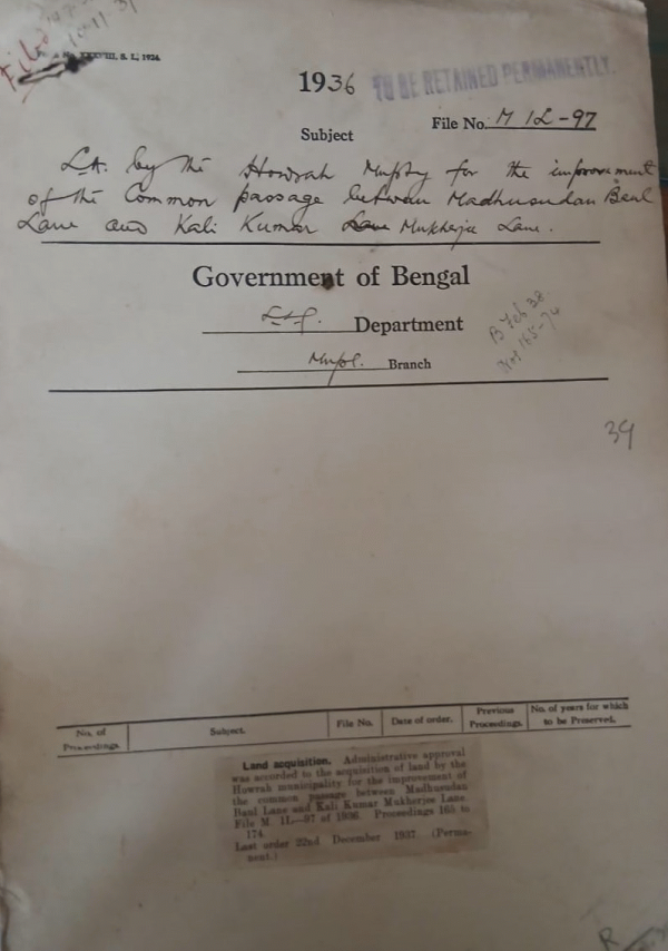 LA by the Howrah Municipality for the Improvement of the Common passage between Madhusuda Baul Lane und Kali Kumar Mukherjee Lane