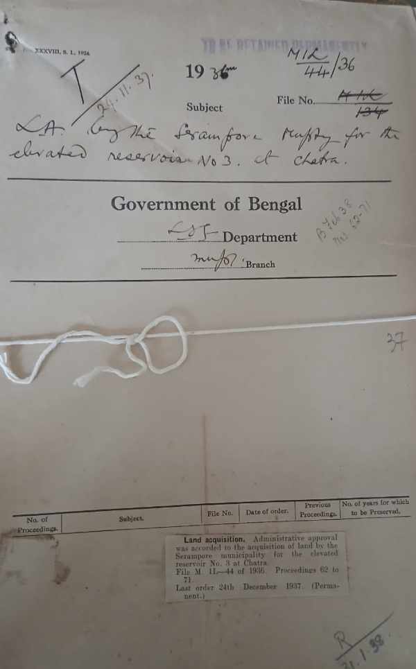 | Rack No. 12, Bundle No. 10 Sl No. 634 LA by the Howrah Municipality for the Improvement of the Common passage between Madhusuda Baul Lane und Kali Kumar Mukherjee Lane | Rack No. 12, Bundle No. 10 Sl No. 635 LA by the Bansberia Municipality for making a Park. | Rack No. 12, Bundle No. 10 Sl No. 636 LA by the Bansberia Municipality for the extension of the football and recreation ground of Ward No. I and II. | Rack No. 12, Bundle No. 10 Sl No. 637 LA by the Serampore Municipality for the elevated reservoir No. 3 at Chatra. | Rack No. 12, Bundle No. 10 Sl No. 638 LA by the Hoogly Chinsurah Municipality for a Municipal Slaughter house. | Rack No. 12, Bundle No. 10 Sl No. 639 A by the Comilla Municipality for widening out the Kalitals Raod. | Rack No. 12, Bundle No. 10 Sl No. 640 Grant of a gratuity to Babu Sarba Ranjan Sidhanta, Late an Account, Dacca Municipality. |
