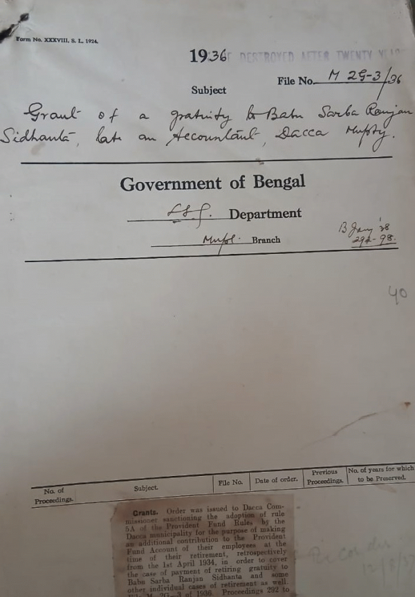| Rack No. 12, Bundle No. 10 Sl No. 637 LA by the Serampore Municipality for the elevated reservoir No. 3 at Chatra. | Rack No. 12, Bundle No. 10 Sl No. 638 LA by the Hoogly Chinsurah Municipality for a Municipal Slaughter house. | Rack No. 12, Bundle No. 10 Sl No. 639 A by the Comilla Municipality for widening out the Kalitals Raod. | Rack No. 12, Bundle No. 10 Sl No. 640 Grant of a gratuity to Babu Sarba Ranjan Sidhanta, Late an Account, Dacca Municipality. | Rack No. 12, Bundle No. 10 Sl No. 641 Leasing out of a plot of P.W.D. Land to the Patuakhali Muncipality for the Construction of a plat form at the bathing ghat. | Rack No. 12, Bundle No. 10 Sl No. 642 L.A. Report 1934-35, Para 14 (b), Uttar Para Municipality. | Rack No. 12, Bundle No. 10 Sl No. 643 Expenditure of Rs. 25/- for Presenting addresses to the Honorable Chief Minister and other Honorable Ministers by Narayanganj Municipality. |