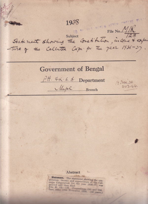 | Rack No. 12, Bundle No. 16, Sl No. 1042 L.A. by the Jalpaiguri Municipality for a municipal Mohamedan Burial ground and a Hindu Burning Ghat. | Rack No. 12, Bundle No. 16, Sl No. 1043 L.A. by the Santipur Municipality for the extension of the Santipur Public Library. | Rack No. 12, Bundle No. 16, Sl No. 1044 L.A. by the Cal. 9 Trust for Improvement scheme no. XIX in ward no. 20 of the Cal. Municipality. | Rack No. 12, Bundle No. 16, Sl No. 1045 Statement showing the constitution income and expenditure of the Cal. Corporation for the year 1936-37. | Rack No. 12, Bundle No. 16, Sl No. 1046 L.A. by the Cal. Corporation for an incinerator on Russa road south. | Rack No. 12, Bundle No. 16, Sl No. 1047 L.A. by the Hawrah Municipality for custing of a bad corner at debnath Banerjee lane Parg. Boro, district Hawrah. | Rack No. 12, Bundle No. 16, Sl No. 1048 L.A. by the Khulna Municipality for the construction of a road at Koliaghat in the village of Toothpara. |