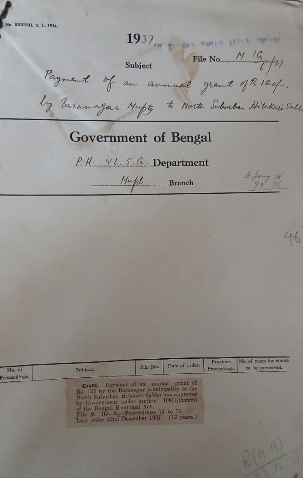 | Rack No. 12, Bundle No. 10 Sl No. 643 Expenditure of Rs. 25/- for Presenting addresses to the Honorable Chief Minister and other Honorable Ministers by Narayanganj Municipality. | Rack No. 12, Bundle No. 10 Sl No. 644 Proposed declaration roads of Nator Municipality as main thorough forces for the Purpose of Section 6(ii) of the Bengal Suppression of Immoral Traffic Act, 1933. | Rack No. 12, Bundle No. 10 Sl No. 645 Budget Estimate for 1937-38 u/h XXXIX and 50 civil works. | Rack No. 12, Bundle No. 10 Sl No. 646 Payment of an annual grant of Rs. 120/- by Baranagar Municipality to North Suburban Hitakari Sabha. | Rack No. 12, Bundle No. 10 Sl No. 647 Condemnation of expenditure incurred by the Halisahar Municipality for road repairs. | Rack No. 12, Bundle No. 10 Sl No. 648 Grant of hating allowance to Dy. Secretary for proceeding to Darjeeling, 1937. | Rack No. 12, Bundle No. 10 Sl No. 649 Scheme for exchange of Publications with Home Government. |