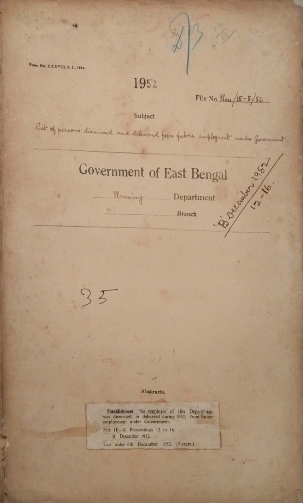 | Rack No. 36, Bundle No. 06, SI No. 312 Half yearly progress report in respect of development schemes revenue department. | Rack No. 36, Bundle No. 06, SI No. 313 Entertainment of official delegates prior approval of finance department to obtain for the expenditure incurred on that account. | Rack No. 36, Bundle No. 06, SI No. 314 Verification of antecedents of class IV employees. | Rack No. 36, Bundle No. 06, SI No. 315 List of persons dismissed and debarred from future employment under govt. | Rack No. 36, Bundle No. 06, SI No. 316 Removal of launch towing high draft wood class No. TD. 46 with Chryster Gasoline Engine etc. from Khulna Depot. by th Dulichand Bothra. | Rack No. 36, Bundle No. 06, SI No. 317 Disposal of 'P' boat No. 496 at Khulna ,East Bengal. | Rack No. 36, Bundle No. 06, SI No. 318 Staff for partition work in the planning department. |