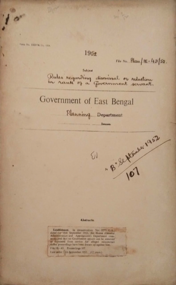 | Rack No. 36, Bundle No. 06, SI No. 320 5th Meeting of the planning Commission. | Rack No. 36, Bundle No. 06, SI No. 321 Panel of names for selection of suitable persons for the awards of fellowship. | Rack No. 36, Bundle No. 06, SI No. 322 Fourth meeting of the consultative Committee on economic development. | Rack No. 36, Bundle No. 06, SI No. 323 Rules regarding dismissal or reduction in rank of a govt. servant. | Rack No. 36, Bundle No. 06, SI No. 324 Recruitment of Bengalee Clerical Personnel for our missions abroad. | Rack No. 36, Bundle No. 06, SI No. 325 Expatriation allowance. | Rack No. 36, Bundle No. 06, SI No. 326 East Bengal Provincial sailors soldiers and Airmans board. |
