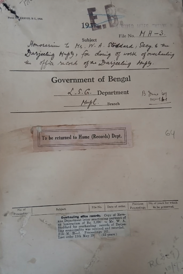 | Rack No. 12, Bundle No. 10 Sl No. 661 L.A. by the C.L. Trust for alignment No. VI-19/1a, Kasi Datt in ward No. 2. | Rack No. 12, Bundle No. 10 Sl No. 662 C.Q. by Mr. Lalit Chandra Das, M.L.A., regarding Proposal for the establishment of a municipality at Feni. | Rack No. 12, Bundle No. 10 Sl No. 663 Amendment in the Superior Service (India) Family Pension fund Rules. | Rack No. 12, Bundle No. 10 Sl No. 664 Honorius to Mr. W.A. Stoddard, Secretary to the Darjeeling Municipality. | Rack No. 12, Bundle No. 10 Sl No. 665 Expenditure in connection with the Celebration of the Coronation Ceremony of His Majesty, the King Emperor, out of the Rangpur Municipal fund. | Rack No. 12, Bundle No. 10 Sl No. 666 L.A. by the Panihaty Municipality for the constraction of the Municipal office building. | Rack No. 12, Bundle No. 10 Sl No. 667 LA by the Chittagong Municipality for the Enayat Bazar girls Moktab (Revised estimate owning to additional Land). |