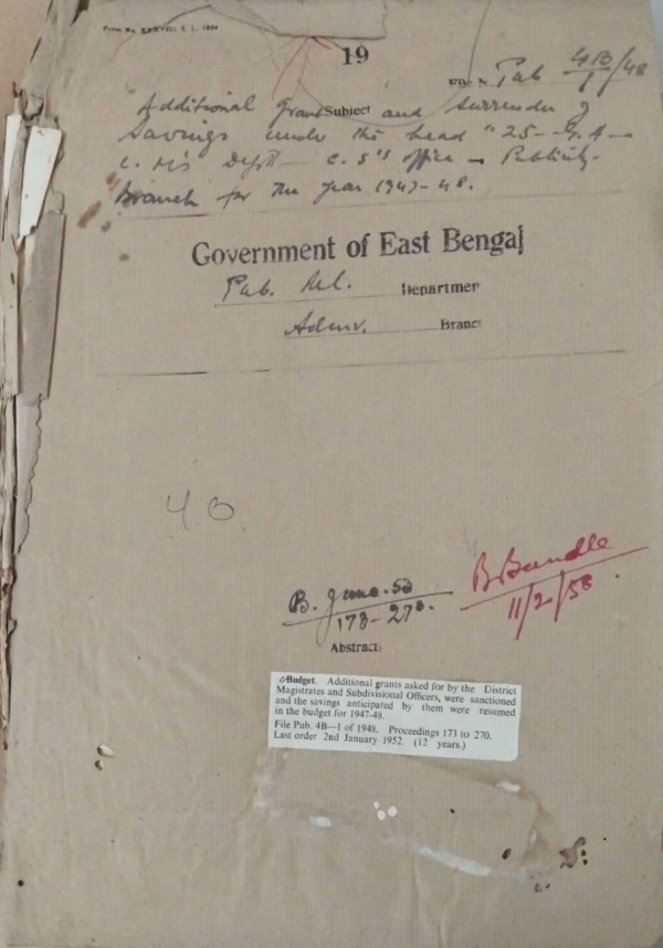 | Rack No. 18, Bundle No. 06, SI No. 450 East Bengal Gazetted Service Revision of Pay Rules, 1950 | Rack No. 18, Bundle No. 07, SI No. 451 Relaxation of age surplus hands for recruitment in the pensionable posts. | Rack No. 18, Bundle No. 07, SI No. 452 Proposed utilizations of the services of the compounder, D.M. Unit Faridpur. | Rack No. 18, Bundle No. 07, SI No. 453 Additional grants and surrender of savings under the head 25-G.A.- C.M.s department C.S.s office publicity branch for the year 1947-48. | Rack No. 18, Bundle No. 07, SI No. 454 Proposed purchase of copies of flim on passing of Quid-e-Azam, for display. | Rack No. 18, Bundle No. 07, SI No. 455 Formation of the Ministry of states and Frontier Regions. | Rack No. 18, Bundle No. 07, SI No. 456 Additional grants and surrender of savings under the head 25-G.A. planning and publicity department and allowance Honoraria etc. publicity branch for the year 1947-48. |