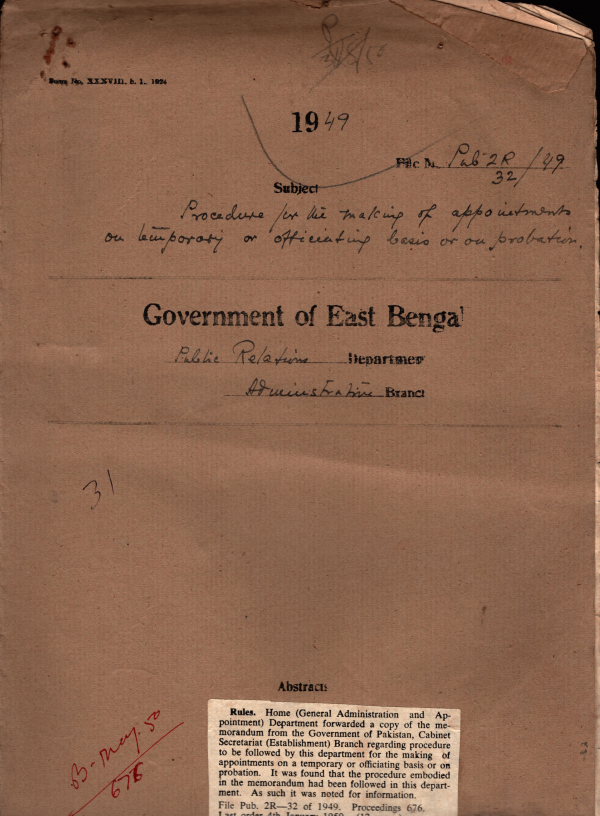 | Rack No. 18, Bundle No. 01, SI No. 30 Distribution of L.T.U. Publications to Various Department act. | Rack No. 18, Bundle No. 01, SI No. 31 Ration of Service Stamps to C.D.O | Rack No. 18, Bundle No. 01, SI No. 32 As the motor van of the District Mobile unit Rajshahi fell into a Dutch due to the negligence of the driver Neyametullah, he was warned to be more careful in future. | Rack No. 18, Bundle No. 01, SI No. 33 Allegation of Malpractice against Maulvi. G. Hyder of his department | Rack No. 18, Bundle No. 01, SI No. 34 Procedure for the making of appointment on temporary or officiating basis or on probation | Rack No. 18, Bundle No. 01, SI No. 35 Arrangement for supply of newspapers to the District and Sub- divisional publicity organization. | Rack No. 18, Bundle No. 01, SI No. 36 Representation at minorities in Service. |