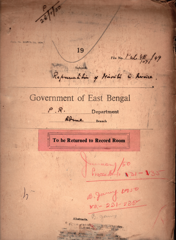 | Rack No. 18, Bundle No. 01, SI No. 32 As the motor van of the District Mobile unit Rajshahi fell into a Dutch due to the negligence of the driver Neyametullah, he was warned to be more careful in future. | Rack No. 18, Bundle No. 01, SI No. 33 Allegation of Malpractice against Maulvi. G. Hyder of his department | Rack No. 18, Bundle No. 01, SI No. 34 Procedure for the making of appointment on temporary or officiating basis or on probation | Rack No. 18, Bundle No. 01, SI No. 35 Arrangement for supply of newspapers to the District and Sub- divisional publicity organization. | Rack No. 18, Bundle No. 01, SI No. 36 Representation at minorities in Service. | Rack No. 18, Bundle No. 01, SI No. 37 Maulvi Abdul Hai was appointed as a temporary lower division assistant with effect from 28th November 1950. | Rack No. 18, Bundle No. 01, SI No. 38 Sanction was accorded on the retention of the staff of the office at Bengali Translator up to the end of February 1950. |