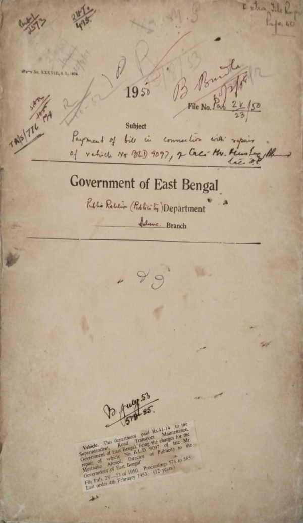 | Rack No. 18, Bundle No. 07, SI No. 462 Supply of copies of sanction contract orders etc. to chief audit and account officer . | Rack No. 18, Bundle No. 07, SI No. 463 Additional allotment required and savings anticipated u/h 25. G.A. civil Secretariat publicity. | Rack No. 18, Bundle No. 07, SI No. 464 Proposed creation of the posts of reporters, one official photographer and a P.A.E. operator. | Rack No. 18, Bundle No. 07, SI No. 465 Payment of bill in connection with repair of vehicle NO. B.L.D. 9097. | Rack No. 18, Bundle No. 07, SI No. 466 Loss of Tarpaulin of the District Mobile Unit Mymensingh (East). | Rack No. 18, Bundle No. 07, SI No. 467 Starred question by Mr. Emaduddin Ahmed regarding the organization of the publicity department | Rack No. 18, Bundle No. 07, SI No. 468 Report of unauthorized movement of the operator, D.M. Unit, Tippera. |