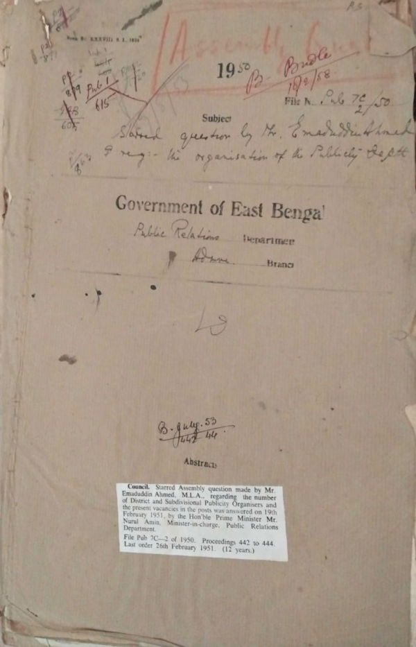| Rack No. 18, Bundle No. 07, SI No. 464 Proposed creation of the posts of reporters, one official photographer and a P.A.E. operator. | Rack No. 18, Bundle No. 07, SI No. 465 Payment of bill in connection with repair of vehicle NO. B.L.D. 9097. | Rack No. 18, Bundle No. 07, SI No. 466 Loss of Tarpaulin of the District Mobile Unit Mymensingh (East). | Rack No. 18, Bundle No. 07, SI No. 467 Starred question by Mr. Emaduddin Ahmed regarding the organization of the publicity department | Rack No. 18, Bundle No. 07, SI No. 468 Report of unauthorized movement of the operator, D.M. Unit, Tippera. | Rack No. 18, Bundle No. 07, SI No. 469 Return of books issued on loan from Secretariat Library. | Rack No. 18, Bundle No. 07, SI No. 470 Observance of Rule 33 of the rules for the management of the secretariat record room. |
