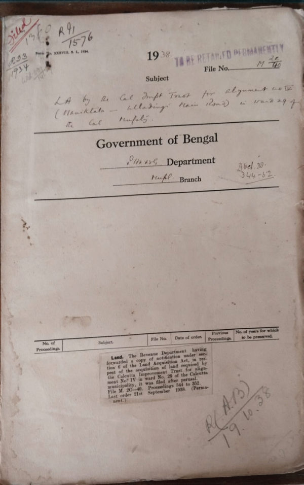 | Rack No. 12, Bundle No. 15, Sl No. 1021 L.A. by the Howrah Municipality for widening Circular Road. | Rack No. 12, Bundle No. 15, Sl No. 1022 L.A. by the Howrah Municipality for opening out a 6 ft drain Chattoo Lal Misir Road in the village of Malipanchgora, Howrah. | Rack No. 12, Bundle No. 15, Sl No. 1023 L.A. by the Calcutta Corporation Improvement trust for alignment No. (IV) in ward No. 3 of the Calcutta Municipality. | Rack No. 12, Bundle No. 15, Sl No. 1024 L.A. by the Calcutta improvement Trust for alignment No. IV in ward 29 of the Calcutta Municipality. | Rack No. 12, Bundle No. 15, Sl No. 1025 L.A. by the Cal. Corporation for widening a portion of Mullick Dispensary Lane. | Rack No. 12, Bundle No. 15, Sl No. 1026 Bye-laws u/s. 245 of the B.M. Act regarding regulation of traffic on public Street, Bankura Municipality. | Rack No. 12, Bundle No. 15, Sl No. 1027 Agreement with Rai Mallinath Roy Bahadur refired Dy-magte. an Dy. Collector, reemployed as Estates Manager. |