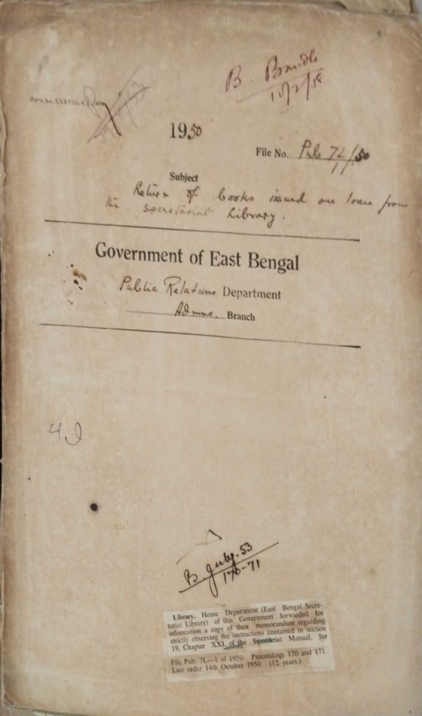 | Rack No. 18, Bundle No. 07, SI No. 466 Loss of Tarpaulin of the District Mobile Unit Mymensingh (East). | Rack No. 18, Bundle No. 07, SI No. 467 Starred question by Mr. Emaduddin Ahmed regarding the organization of the publicity department | Rack No. 18, Bundle No. 07, SI No. 468 Report of unauthorized movement of the operator, D.M. Unit, Tippera. | Rack No. 18, Bundle No. 07, SI No. 469 Return of books issued on loan from Secretariat Library. | Rack No. 18, Bundle No. 07, SI No. 470 Observance of Rule 33 of the rules for the management of the secretariat record room. | Rack No. 18, Bundle No. 07, SI No. 471 Grant of H.B. Advance to Mr. Anwar Hossain D.D. of publicity. | Rack No. 18, Bundle No. 07, SI No. 472 Arrangement of publicity work of Satkhira and Bagerhat sub-division. |