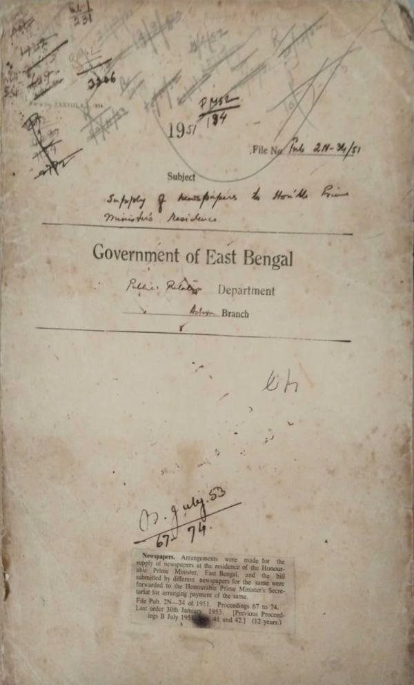 | Rack No. 18, Bundle No. 07, SI No. 476 Restriction on the use of govt. transport. | Rack No. 18, Bundle No. 07, SI No. 477 Payment of rents fr occupation f the inspection Banglow by the district and sub-divisional publicity organization. | Rack No. 18, Bundle No. 07, SI No. 478 Auction sale of one water proof with head of cover of this department | Rack No. 18, Bundle No. 07, SI No. 479 Supply of newspapers to Honorable Prime Ministers residence. | Rack No. 18, Bundle No. 07, SI No. 480 Itinerary of Mr. Jasimuddin song organizer, in Europe. | Rack No. 18, Bundle No. 07, SI No. 481 Pakistan citizenship Act,1951. | Rack No. 18, Bundle No. 07, SI No. 482 Appointment of L.D. and U.D.A. in the P.R. department. |