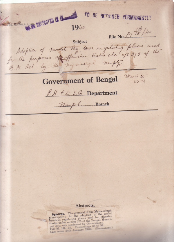 Adoption of model bylaws regulating places used for the purposes of offensive trades u/s 375 of the B.M Act by the Mymensingh Municipality.