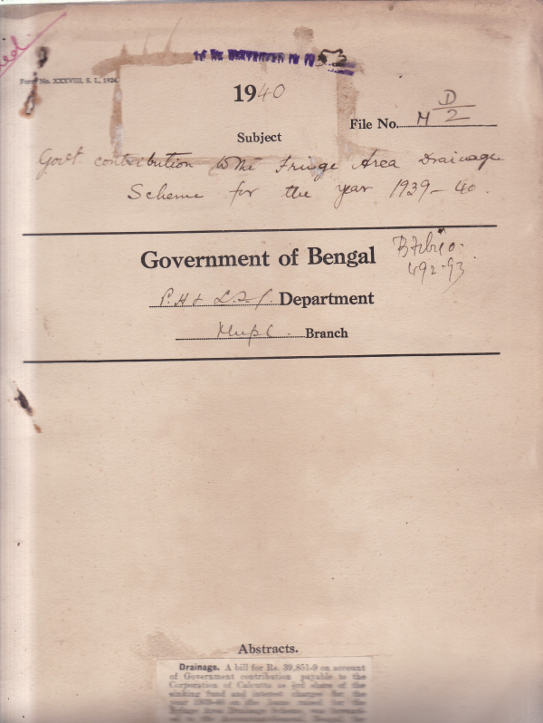 | Rack No. 12, Bundle No. 16, Sl No. 1091 Regulation under the electricity Rules 1937. | Rack No. 12, Bundle No. 16, Sl No. 1092 Adoption of model by-laws regarding maintenance of survey maps by the Mymensingh Municipality u/s 463 of the Act. | Rack No. 12, Bundle No. 16, Sl No. 1093 Creation of posts of Stationary veterinary assistant surgeons. | Rack No. 12, Bundle No. 16, Sl No. 1094 Govt. Contribution to the Fringe Area Drainage scheme for the year 1939-40. | Rack No. 12, Bundle No. 16, Sl No. 1095 L.A. by the Chandpur Municipality for a free Primary School for boys in ward no. 3. | Rack No. 12, Bundle No. 16, Sl No. 1096 L.A. by the Howrah Municipality for easing out and improving a Corner at the junction of Gopal banerjee lane and Nepal saha lane. | Rack No. 12, Bundle No. 16, Sl No. 1097 L.A. by the North Barracpur Municipality for the burring ghat at Ichapur. |