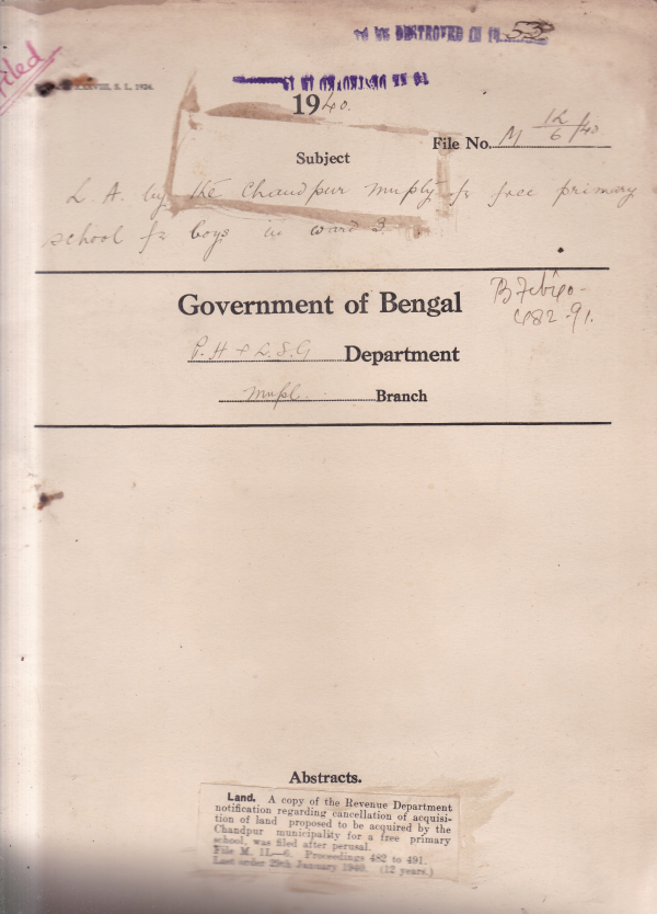 | Rack No. 12, Bundle No. 16, Sl No. 1092 Adoption of model by-laws regarding maintenance of survey maps by the Mymensingh Municipality u/s 463 of the Act. | Rack No. 12, Bundle No. 16, Sl No. 1093 Creation of posts of Stationary veterinary assistant surgeons. | Rack No. 12, Bundle No. 16, Sl No. 1094 Govt. Contribution to the Fringe Area Drainage scheme for the year 1939-40. | Rack No. 12, Bundle No. 16, Sl No. 1095 L.A. by the Chandpur Municipality for a free Primary School for boys in ward no. 3. | Rack No. 12, Bundle No. 16, Sl No. 1096 L.A. by the Howrah Municipality for easing out and improving a Corner at the junction of Gopal banerjee lane and Nepal saha lane. | Rack No. 12, Bundle No. 16, Sl No. 1097 L.A. by the North Barracpur Municipality for the burring ghat at Ichapur. | Rack No. 12, Bundle No. 16, Sl No. 1098 L.A. by the Pautuakhali Municipality for a Christian burial ground at Pautuakhali. |