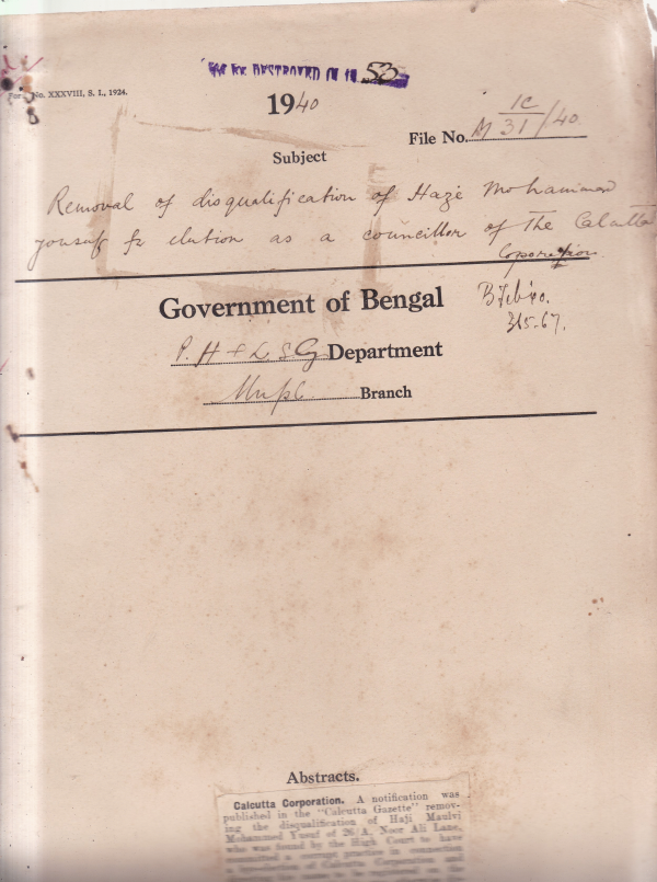 Removal of disqualification of Haji Mulvi Mohammad Yusuf for caution as a councilor of the Calcutta Corporation.