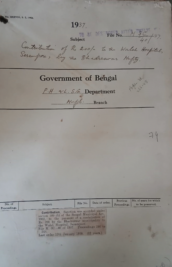 Contribution of Rs. 200/- to the Walsh Hospital, Serampore by the Bhadreswar Municipality.