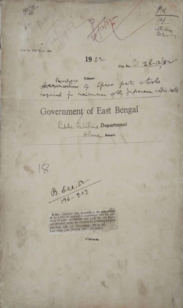 | Rack No. 18, Bundle No. 07, SI No. 491 Change of designation of D.P.O. Chittagong to district publicity organizer. | Rack No. 18, Bundle No. 07, SI No. 492 Rules for Accreditation of press correspondents in East Bengal. | Rack No. 18, Bundle No. 07, SI No. 493 Grant of permission of Ananda Mohan Biswas for Datara recital at the radio Pakistan, Dacca. | Rack No. 18, Bundle No. 07, SI No. 494 Purchase of spare art and tools required for maintenance of the Japanese radio sets. | Rack No. 18, Bundle No. 07, SI No. 495 Report of the motor mechanic regarding poor maintenance and servicing of the vehicles. | Rack No. 18, Bundle No. 07, SI No. 496 Sureties of Mr. Hussain (D.P.). and Mr. Anwar Hussain (D.D.P) for loan of Rs. 2000/- form the Pak. Refugee rehabilitation finance corporation. | Rack No. 18, Bundle No. 07, SI No. 497 Sanction for purchase of two copies of daily Newspapers for the use of the District and sub-divisional publicity organizers. |