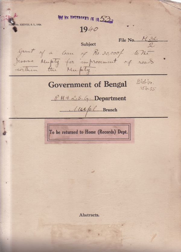 Grant of a l;oan of Rs. 30000/- to the Jessore MUnicipality for Improvement of roads within the Municipality.