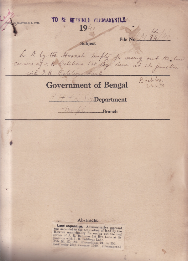 L.A. by the Howrah Municipality for easing out a bad corners of I.R. Belilions 1st lane at its junction with I.R. Belilions Lane.