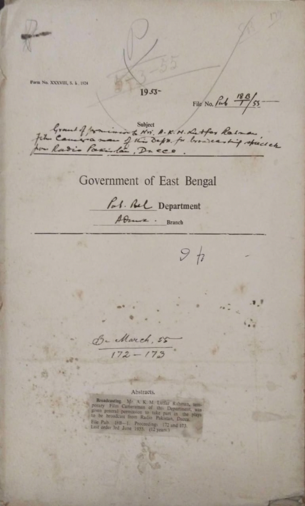 Grant of permission to Mvi. A.K.M. Lutfal Rahman , film cameraman to take part in the plays to be broadcast from radio Pakistan Dacca.