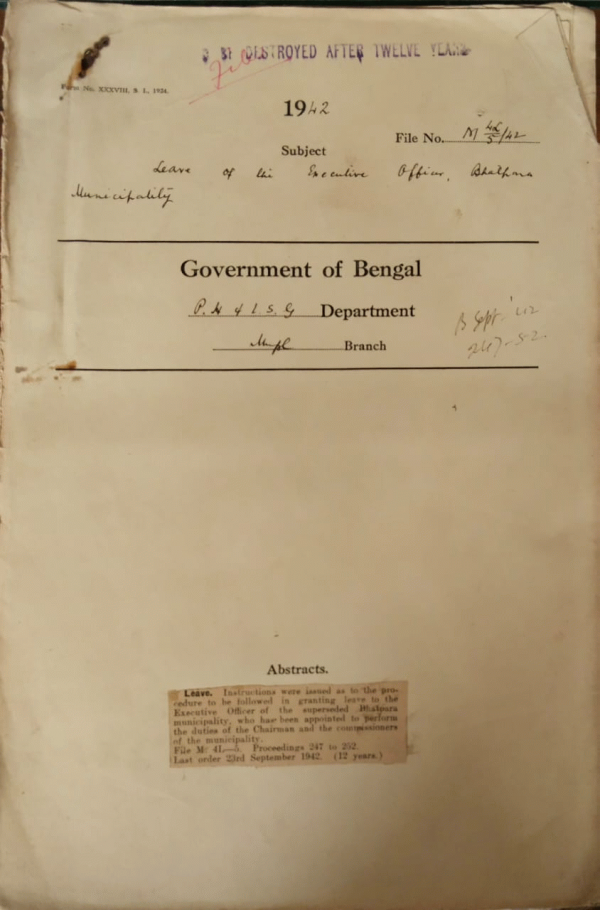 | Rack No. 13, Bundle No. 26, Sl No. 1737 Payment of municipal tax for premises No. 3 Charnock Place at Calcutta. | Rack No. 13, Bundle No. 26, Sl No. 1738 L.A. by the Cal. Corporation for widening the passage abutting on premises No. 136, 140, 144, 145 and 146 Maniktola Road in ward no. 3. | Rack No. 13, Bundle No. 26, Sl No. 1739 Date of remission u/s. 141 of the Bengal Municipal Act, 1932. | Rack No. 13, Bundle No. 26, Sl No. 1740 Leave of the Executive officer, Bhatpara Municipality. | Rack No. 13, Bundle No. 26, Sl No. 1741 L.A. by the Chandpur Municipality for construction of a free primary school in ward no. III. | Rack No. 13, Bundle No. 26, Sl No. 1742 Adoption of model bye-laws regulating construction of buildings in leas advanced municipalities by the Kharoah Municipality. | Rack No. 13, Bundle No. 26, Sl No. 1743 Expenditure of Rs. 35/- incurred by the Tamluk Municipality in Presenting an address of welcome to the Honorable Minister in Charge of P.H. and L.S.G. Department. |