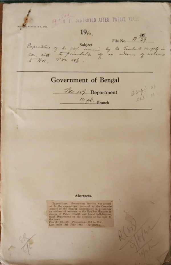 | Rack No. 13, Bundle No. 26, Sl No. 1740 Leave of the Executive officer, Bhatpara Municipality. | Rack No. 13, Bundle No. 26, Sl No. 1741 L.A. by the Chandpur Municipality for construction of a free primary school in ward no. III. | Rack No. 13, Bundle No. 26, Sl No. 1742 Adoption of model bye-laws regulating construction of buildings in leas advanced municipalities by the Kharoah Municipality. | Rack No. 13, Bundle No. 26, Sl No. 1743 Expenditure of Rs. 35/- incurred by the Tamluk Municipality in Presenting an address of welcome to the Honorable Minister in Charge of P.H. and L.S.G. Department. | Rack No. 13, Bundle No. 26, Sl No. 1744 Amendment of bye-laws 40 of the by-laws regarding Maximun load for carts on road as adopted by the Darjeeling Municipality. | Rack No. 13, Bundle No. 26, Sl No. 1745 Audit of accounts of Chittagong Municipality for 1941-42. | Rack No. 13, Bundle No. 26, Sl No. 1746 Proposed extension of Schedule VI of the B.M. Act to the Kamarhat Municipality. |