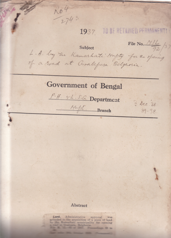 | Rack No. 12, Bundle No. 16, Sl No. 1108 L.A. by the Howrah Municipality for easing out a bad corners of I.R. Belilions 1st lane at its junction with I.R. Belilions Lane. | Rack No. 12, Bundle No. 16, Sl No. 1109 L.A. by the Howrah Municipality for easing out a bad corner at the ham Ghosh lane in the village of Salkia. | Rack No. 12, Bundle No. 16, Sl No. 1110 C.Q. by khan Bahadur Muazzamuddin Hosain regarding the extension of the office of the chief Executive officer, Cal. Corporation. | Rack No. 12, Bundle No. 16, Sl No. 1112 L.a. by the Kamarhati Municipality for opening of a road at Goalpara , Belghoria. | Rack No. 12, Bundle No. 6, Sl No. 331 L..A. by Calcutta Improvement Trust for Alignment No. IX. | Rack No. 12, Bundle No. 6, Sl No. 332 L.A. by Calcutta Improvement Trust for Allignment No. XI. | Rack No. 12, Bundle No. 6, Sl No. 333 Position of the municipalities in the Burdwan Divisionfor not taking Oath of allegiance to the Crown by the Commissioners. |