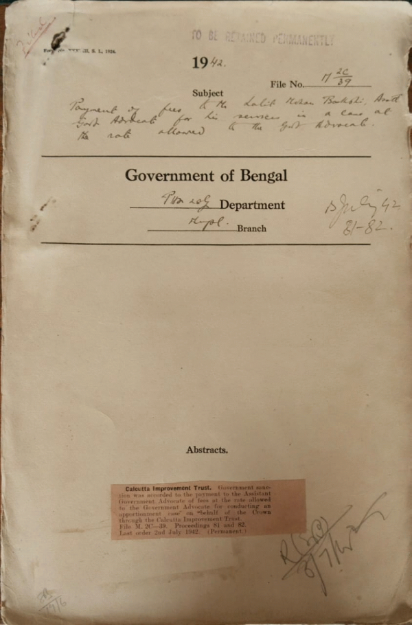 | Rack No. 13, Bundle No. 26, Sl No. 1754 Representation from Hony. Assistant Secretary Medially Library regarding Closure of the Library by the Garden Reach Municipality. | Rack No. 13, Bundle No. 26, Sl No. 1755 Extension of the war Injuries scheme 1942 to the Chittagong Municipality. | Rack No. 13, Bundle No. 26, Sl No. 1756 Sanction to the payment of grain compensation allowance of Rs. 2 per menses per head to the whale time employees of the Cal. Imp. Trust. | Rack No. 13, Bundle No. 26, Sl No. 1757 Payment of fees to Mr. Lalit Mohan Baksi, Asstt. Govt. Advocate for his service in case at the rate allowed to the Govt. Advocate. | Rack No. 13, Bundle No. 26, Sl No. 1758 Proposal for establishment of a separate municipality at Chinsurah. | Rack No. 13, Bundle No. 26, Sl No. 1759 Preparation of electoral rolls of the corporation of Calcutta. | Rack No. 13, Bundle No. 26, Sl No. 1760 Postponement of gencral Election of the Bhadreswar Municipality. |