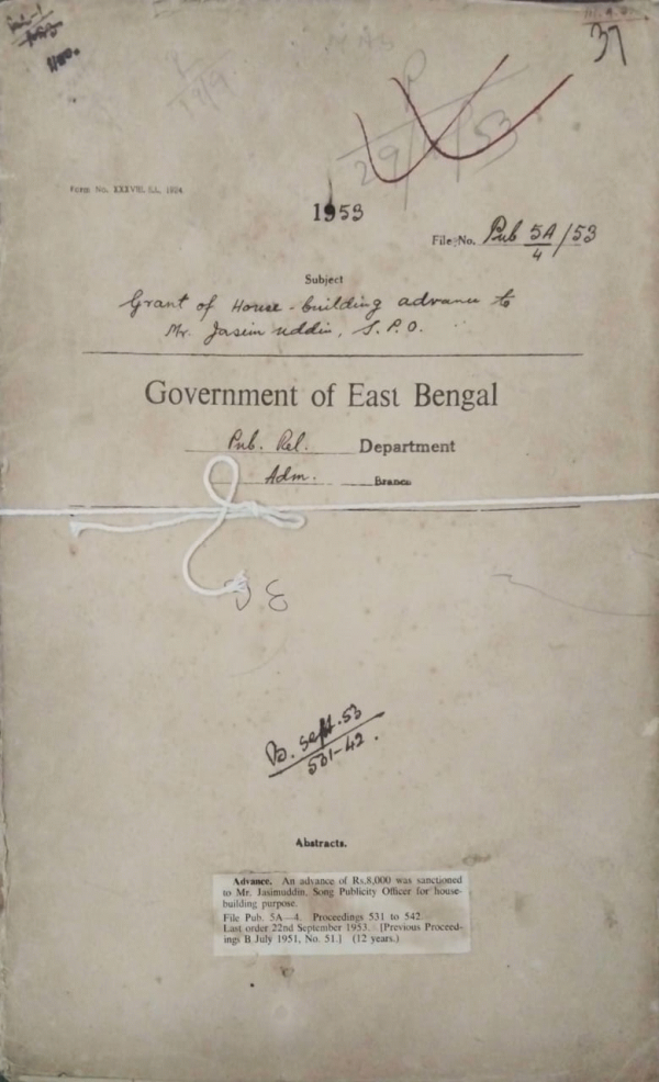 | Rack No. 18, Bundle No. 07, SI No. 511 Action taken against Mr. Abdul Karim D.P.O. Bakarganj for his unauthorized absence. | Rack No. 18, Bundle No. 07, SI No. 512 Revised estimate 1952-54 u/h 63-B Development. | Rack No. 18, Bundle No. 07, SI No. 513 Grant of house building advance to Mr. Md. Hussain assistant of B.T.s office. | Rack No. 18, Bundle No. 07, SI No. 514 Grant of house building advance to Mr. Jasim Uddin S.P.O. | Rack No. 18, Bundle No. 07, SI No. 515 Grant of leave to Gazetted govt. servants. | Rack No. 18, Bundle No. 08, SI No. 516 Proposed disposal of the motor car of M.K.M. Ahmed Late D.P. of East Bengal. | Rack No. 18, Bundle No. 08, SI No. 517 Promotion of assistant operators Mvi. Maidul Haq and Md. Jaffer assistant operator to post of operator. |