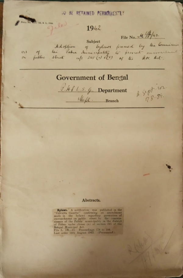 | Rack No. 13, Bundle No. 26, Sl No. 1762 Adoption of bye-laws u/s 269(a) of the B.M. Act. 32 regarding Disposal of Sewage offerince matter and etc by the Jamalpur Municipality. | Rack No. 13, Bundle No. 26, Sl No. 1764 Adoption of bye-laws u/s 417 of the B.M. Act, 32 regarding standardization of weight and measures by the Jamalpur Municipality. | Rack No. 13, Bundle No. 26, Sl No. 1765 Inspection note of the Gaibandha Municipality. | Rack No. 13, Bundle No. 26, Sl No. 1766 Inspectional Note Rangpur Municipality. | Rack No. 13, Bundle No. 26, Sl No. 1767 Adoption of by-laws framed by the commissioners of the Pabna Municipality to prevent encroachment on public street u/s 245 (a) and (b) of the B.M. Act. | Rack No. 13, Bundle No. 26, Sl No. 1768 Sale price of the Annual Report of the Local Audit Department for the year 1940-41. | Rack No. 13, Bundle No. 26, Sl No. 1769 L.A. Report 1934-35 Pang. 19(IV) Howrah Municipality. |