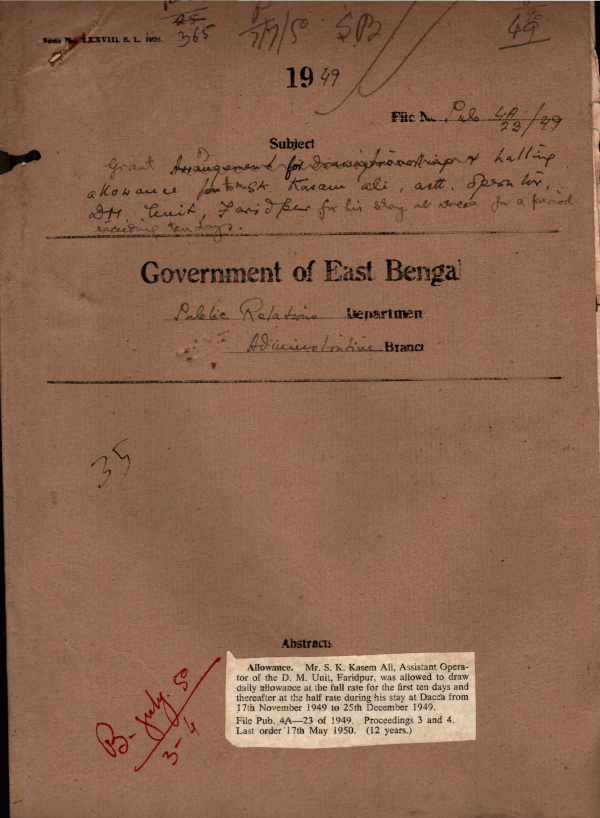 Mr. S.K. Kasem Ali Assistant operator of the D.M. Unit Faridpur was allowed to draw daily allowance at the full rate for the first ten days and thereafter at the half rate during his stay al Dacca from 17th November 1949 to 25th December1949.