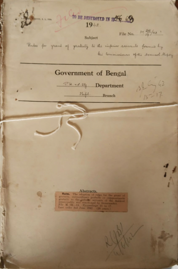 | Rack No. 13, Bundle No. 26, Sl No. 1772 Irregularity of the election of vice-chairman, Titagarh Municipality. | Rack No. 13, Bundle No. 26, Sl No. 1773 Sanction to the continuance of the pay cut of the Municipality offices, of the Howrah Municipality drawing a Salary of Rs. 200/- and more. | Rack No. 13, Bundle No. 26, Sl No. 1774 Annual administration report of the Bankura Municipality for the year 1941-42. | Rack No. 13, Bundle No. 26, Sl No. 1775 Annual administration report of the Bankura Municipality for the year 1941-42. | Rack No. 13, Bundle No. 26, Sl No. 1776 Rules for grant of gratuity to the inferior servants framed by the commissioners of the Asansol Municipality. | Rack No. 13, Bundle No. 26, Sl No. 1777 Interpretation of Sections 14 and 16 of the Calcutta Improvement Act. | Rack No. 13, Bundle No. 26, Sl No. 1778 Payment of contribution of Rs. 50/- to the Serampore Sub divisional Tuberculosis Association by the Kotrung Municipality |