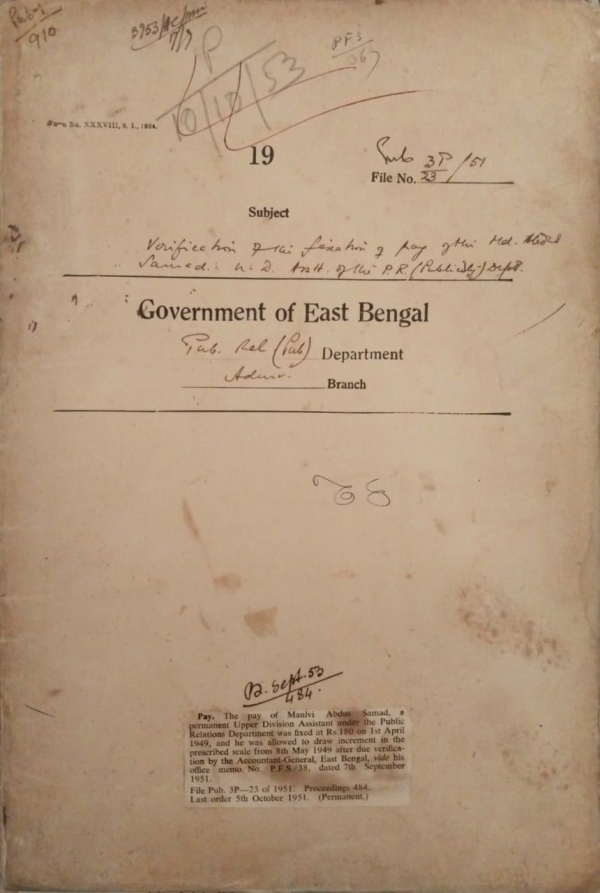 | Rack No. 18, Bundle No. 08, SI No. 527 Proposal from D.P.O. Kushtia to purchase office furniture out of the fund of the contingent express. | Rack No. 18, Bundle No. 08, SI No. 528 Prayer for rumination by ex . engineer electrical division ,Dacca in connection with her repair of publicity equipment. | Rack No. 18, Bundle No. 08, SI No. 529 Purchase of convertors for use of this department and payment of some outstanding bills. | Rack No. 18, Bundle No. 08, SI No. 530 Verification of the fixation of pay of Md. Abdul Samad U.D.A. of the P.R. department. | Rack No. 18, Bundle No. 08, SI No. 531 Terms to be allowed to govt. officials selected for the award of Scholarships and fellowships by the United Nations. | Rack No. 18, Bundle No. 08, SI No. 532 Use of Technical Consultants under the technical co-operation schemes Colombo plan. | Rack No. 18, Bundle No. 08, SI No. 533 Counting of war services for the purpose of fixation of pay of the war services personnel appointed to civil posts. |
