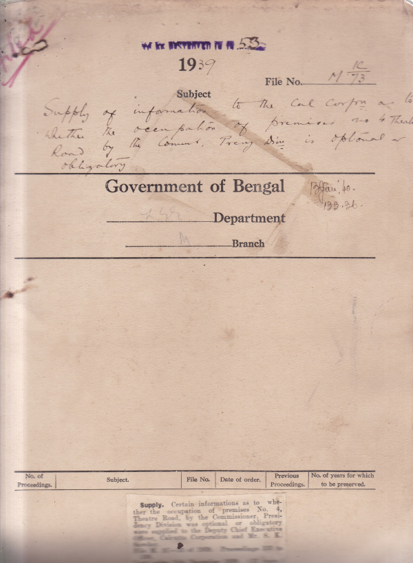 Supply of information to the Calcutta Corporation as to whether the occupation of premises no. 4 Theater road by the commissiner.