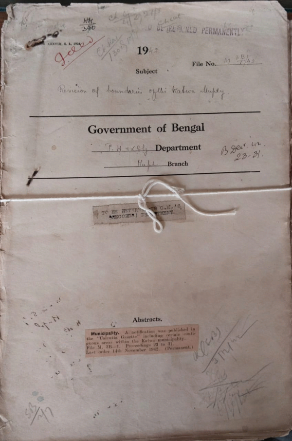 | Rack No. 13, Bundle No. 26, Sl No. 1787 Allocation of the Govt. Share of contribution for additional gratuity payable to the Chief Engineer and Dy. C.E. of the Cal. 9mp. Trust. | Rack No. 13, Bundle No. 26, Sl No. 1788 Construction of a road on C.A.V. Range, Barrackpore. | Rack No. 13, Bundle No. 26, Sl No. 1789 L.A. by the Kushtia Municipality for the Menial's burial ground. | Rack No. 13, Bundle No. 26, Sl No. 1790 Extension of the boundary of the Katwa Municipality. | Rack No. 13, Bundle No. 26, Sl No. 1791 Sanction of monthly expenditure of running three audit schools by Serampore Municipality. | Rack No. 13, Bundle No. 26, Sl No. 1792 Revision of boundary, Patuakhali Municipality. | Rack No. 13, Bundle No. 26, Sl No. 1793 Council Question by Khan Bahadur Salyed Muzzamuddin Hossain regarding Burial Ground Boards. |